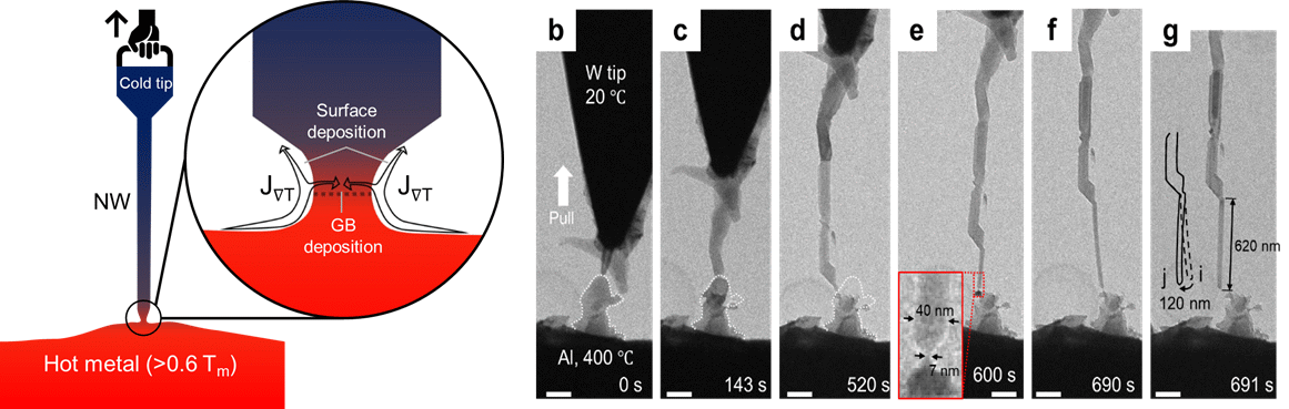 metal nanowires via thermomigration across a nanoscale