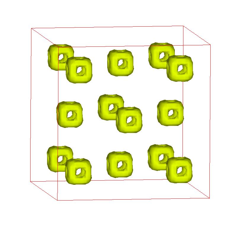 The following are valence charge density iso-surface plots of 22 crystals at their stress-free ground-states calculated using VASP. Click on 'movie' to see the animations where the contour values are varied from minimum to maximum (movie +) and from maximum to minimum (movie -) valence charge density ( h = rho x Vcell ). Three snapshots are taken in each movie and are shown on the right. Click on the thumbnail for larger view.